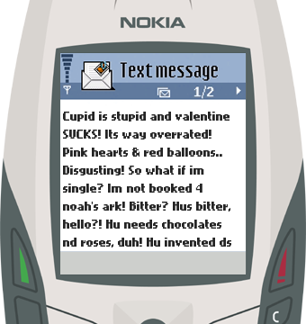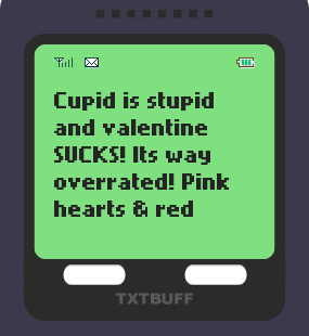 Cupid is stupid and valentine SUCKS! Its way overrated! Pink hearts & red balloons.. Disgusting! So what if im single? Im not booked 4 noah’s ark! Bitter? Hus bitter, hello?! Hu needs chocolates nd roses, duh! Hu invented ds holiday anyway?.. Hope u survive today..Happy anti-valentines day!Ü